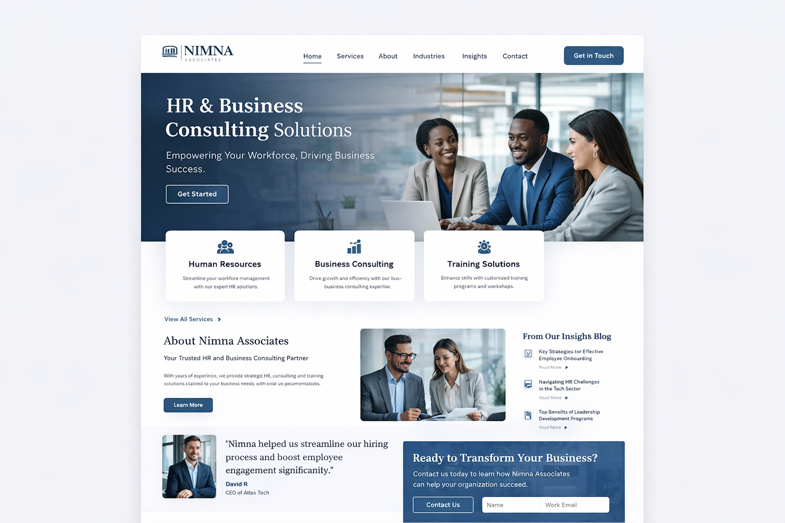 The primary goal of this project was to create a refined digital presence that clearly communicates NIMNA Associate’s expertise in training, strategy development, staff outsourcing, and HR outsourcing, while positioning the firm as a trusted partner for both growing businesses and established enterprises.